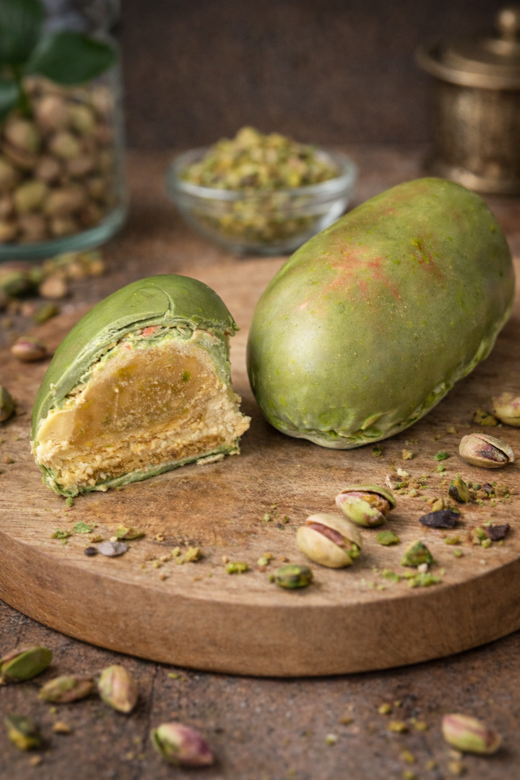 Une mousse pistache pure, un cœur croustillant au kadayif, un crémeux pistache et ses éclats croquant. Pose sur une génoise moelleuse et enrobé d'une coque craquante đź’š